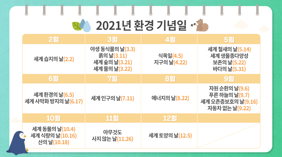 이렇게 달력을 보면서 다른 환경 기념일도 찾아보고, 의미 있는 신년 계획을 세워보세요.