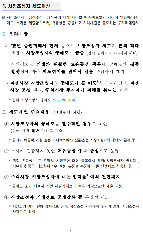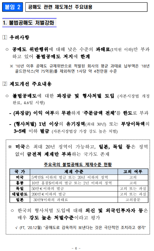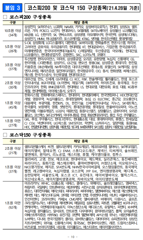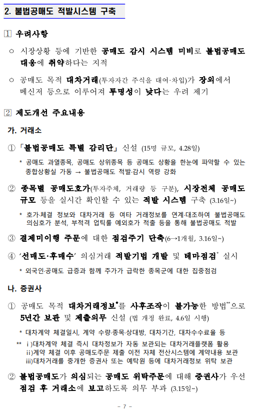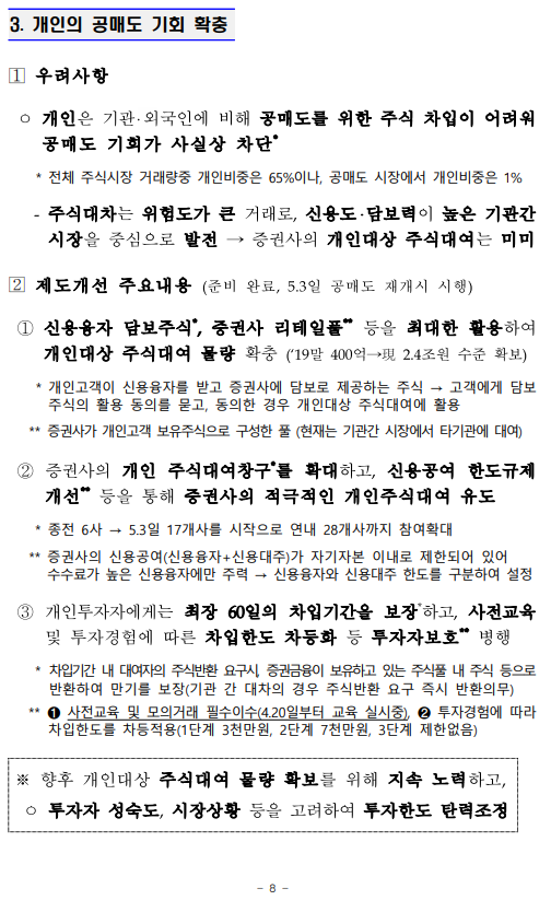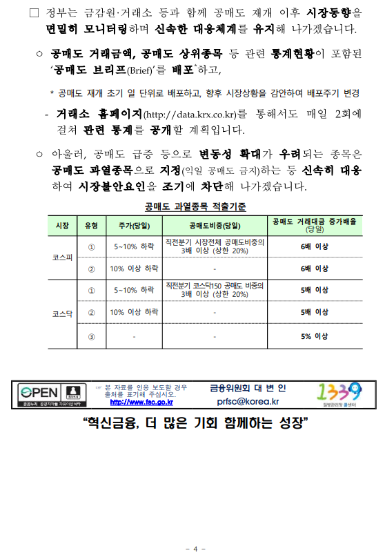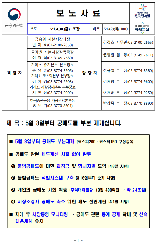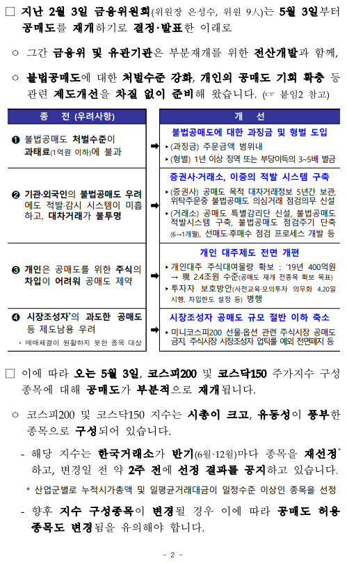 - 1 - 제 목 : 5월 3일부터 공매도를 부분 재개합니다. ■ 5월 3일부터 공매도 부분재개 (코스피200·코스닥150 구성종목) ■ 공매도 관련 제도개선 차질 없이 완료 ➊ 불법공매도에 대한 과징금 및 형사처벌 도입 (4.6일 시행) ➋ 불법공매도 적발시스템 구축 (3.16일부터 순차 시행) ➌ 개인의 공매도 기회 확충 (주식대여물량 ’19말 400억원 → 약 2.4조원) ➍ 시장조성자 공매도 축소 위한 제도 전면개편 (4.1일 시행) ■ 재개 후 시장동향 모니터링 → 공매도 관련 통계 공개 확대 및 신속 대응체계 유지 보 도 자 료 보도 ’21.4.30.(금), 조간 배포 ‘21.4.29.(목), 10:00 책 임 자 금융위 자본시장과장 변 제 호(02-2100-2650) 담 당 자 김경호 사무관(02-2100-2655) 금감원 자본시장감독국장 이 경 식(02-3145-7580) 권영발 팀 장(02-3145-7611) 거래소 유가본부 본부장보 송 영 훈(02-3774-8505) 거래소 코스닥본부 본부장보 김 기 경(02-3774-9503) 거래소 시장감시본부 본부장보 지 천 삼(02-3774-9002) 정규일 부 장(02-3774-8580) 김재향 부 장(02-3774-9600) 이재훈 부 장(02-3774-9250) 한국증권금융 자금운용본부장 홍 인 기(02-3770-8504) 박상묵 부 장(02-3770-8890) - 2 - □ 지난 2월 3일 금융위원회(위원장 은성수, 위원 9人)는 5월 3일부터 공매도를 재개하기로 결정·발표한 이래로 ㅇ 그간 금융위 및 유관기관은 부분재개를 위한 전산개발과 함께, ㅇ 불법공매도에 대한 처벌수준 강화, 개인의 공매도 기회 확충 등 관련 제도개선을 차질 없이 준비해 왔습니다. (☞ 붙임2 참고) 종 전 (우려사항) 개 선 ➊ 불법공매도 처벌수준이 과태료(1억원 이하)에 불과 ➡ 불법공매도에 대한 과징금 및 형벌 도입 ▸(과징금) 주문금액 범위내 ▸(형벌) 1년 이상̇ ̇ 징역 또는 부당이득의 3~5배 벌금 ➋ 기관·외국인의 불법공매도 우려 에도 적발·감시 시스템이 미흡 하고, 대차거래가 불투명 ➡ 증권사·거래소, 이중의 적발 시스템 구축 ▸(증권사) 공매도 목적 대차거래정보 5년간 보관, 위탁주문중 불법공매도 의심거래 점검의무 신설 ▸(거래소) 공매도 특별감리단 신설, 불법공매도 적발시스템 구축, 불법공매도 점검주기 단축 (6→1개월), 선매도·후매수 점검 프로세스 개발 등 ➌ 개인은 공매도를 위한 주식의 차입이 어려워 공매도 제약 ➡ 개인 대주제도 전면 개편 ▸개인대주 주식대여물량 확보 : ’19년 400억원 → 現 2.4조원 수준(공매도 재개 전종목 확보 목표) ▸투자자 보호방안(사전교육·모의투자 의무화 4.20일 시행, 차입한도 설정 등) 병행 ➍ 시장조성자*의 과도한 공매도 등 제도남용 우려 * 매매체결이 원활하지 못한 종목 대상 ➡ 시장조성자 공매도 규모 절반 이하 축소 ▸미니코스피200 선물·옵션 관련 주식시장 공매도 금지, 주식시장 시장조성자 업틱룰 예외 전면폐지 등 □ 이에 따라 오는 5월 3일, 코스피200 및 코스닥150 주가지수 구성 종목에 대해 공매도가 부분적으로 재개됩니다. ㅇ 코스피200 및 코스닥150 지수는 시총이 크고, 유동성이 풍부한 종목으로 구성되어 있습니다. - 해당 지수는 한국거래소가 반기(6월·12월)마다 종목을 재선정* 하고, 변경일 전 약 2주 전에 선정 결과를 공지하고 있습니다. * 산업군별로 누적시가총액 및 일평균거래대금이 일정수준 이상인 종목을 선정 - 향후 지수 구성종목이 변경될 경우 이에 따라 공매도 허용 종목도 변경됨을 유의해야 합니다. - 3 - ㅇ 개인투자자들도 증권금융 및 증권사에서 제공하는 ‘개인대주 (貸株)제도’를 통해 해당 종목에 대한 공매도 투자가 가능합니다. - ‘신용융자’ 서비스를 제공하는 28개 증권사 中, 5월 3일부터 17개사를 통해 해당 서비스를 이용할 수 있으며, 연내 28개사 전부에서 이용이 가능(전산개발 예정)해집니다. ※ (5.3일) NH투자, 키움, 신한금투, 대신, SK, 유안타, 한국투자, 하나, KB, 삼성, 교보, 미래에셋, 케이프, BNK, 상상인, 한양, 부국(17개사) (연내) 이베스트, 유진, 하이, 메리츠, KTB, IBK, DB, 한화, 현대차, 신영, 유화(11개사) ◇ 증권사별 서비스 개시일정은 전산개발, 테스트 기간 등에 따라 일부변동 가능 - 다만, 공매도를 위해 미리 사전교육(협회) 및 모의투자(거래소)를 이수해야 하며, 증권사별 차입한도* 내에서만 거래할 수 있습니다. * (예) 공매도 투자경험에 따라 3천만원 → 7천만원 → 한도 없음 ※ 공매도 금지조치와 함께 시행되었던 ‘1일 자기주식 취득 특례조치’ 및 ‘증권사 신용융자담보비율 유지의무 면제조치’도 5월 3일부터 해제 □ 향후 공매도 투자를 함에 있어 모든 투자자는 다음의 사항을 반드시 유의해야 합니다. ➊ 공매도 법규 위반시 형사처벌까지 받을 수 있으므로, 투자자는 무차입공매도 등이 발생하지 않도록 각별히 주의해야 합니다. ➋ 상장기업의 유상증자 기간중 공매도 한 자는 해당 증자에 참여할 수 없습니다. 위반시 과징금(부당이득 1.5배 이하)이 부과됩니다. ➌ 공매도 목적으로 주식을 빌린 자는 해당 정보를 사후조작이 불가능한 방법으로 5년간 보관해야 하며 위반시 과태료(위반 건당 1억원 이하)가 부과됩니다. ➍ 또한, 공매도 잔고가 일정 수준* 이상인 투자자는 금융위와 거래소에 그 내역을 보고해야 하며, 위반시 과태료(위반 건당 1억원 이하)가 부과됩니