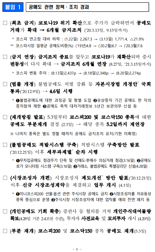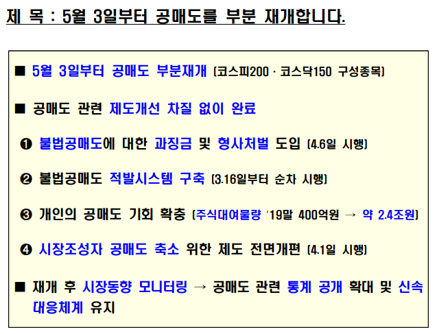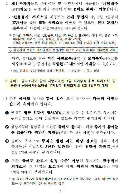 - 1 - 제 목 : 5월 3일부터 공매도를 부분 재개합니다. ■ 5월 3일부터 공매도 부분재개 (코스피200·코스닥150 구성종목) ■ 공매도 관련 제도개선 차질 없이 완료 ➊ 불법공매도에 대한 과징금 및 형사처벌 도입 (4.6일 시행) ➋ 불법공매도 적발시스템 구축 (3.16일부터 순차 시행) ➌ 개인의 공매도 기회 확충 (주식대여물량 ’19말 400억원 → 약 2.4조원) ➍ 시장조성자 공매도 축소 위한 제도 전면개편 (4.1일 시행) ■ 재개 후 시장동향 모니터링 → 공매도 관련 통계 공개 확대 및 신속 대응체계 유지 보 도 자 료 보도 ’21.4.30.(금), 조간 배포 ‘21.4.29.(목), 10:00 책 임 자 금융위 자본시장과장 변 제 호(02-2100-2650) 담 당 자 김경호 사무관(02-2100-2655) 금감원 자본시장감독국장 이 경 식(02-3145-7580) 권영발 팀 장(02-3145-7611) 거래소 유가본부 본부장보 송 영 훈(02-3774-8505) 거래소 코스닥본부 본부장보 김 기 경(02-3774-9503) 거래소 시장감시본부 본부장보 지 천 삼(02-3774-9002) 정규일 부 장(02-3774-8580) 김재향 부 장(02-3774-9600) 이재훈 부 장(02-3774-9250) 한국증권금융 자금운용본부장 홍 인 기(02-3770-8504) 박상묵 부 장(02-3770-8890) - 2 - □ 지난 2월 3일 금융위원회(위원장 은성수, 위원 9人)는 5월 3일부터 공매도를 재개하기로 결정·발표한 이래로 ㅇ 그간 금융위 및 유관기관은 부분재개를 위한 전산개발과 함께, ㅇ 불법공매도에 대한 처벌수준 강화, 개인의 공매도 기회 확충 등 관련 제도개선을 차질 없이 준비해 왔습니다. (☞ 붙임2 참고) 종 전 (우려사항) 개 선 ➊ 불법공매도 처벌수준이 과태료(1억원 이하)에 불과 ➡ 불법공매도에 대한 과징금 및 형벌 도입 ▸(과징금) 주문금액 범위내 ▸(형벌) 1년 이상̇ ̇ 징역 또는 부당이득의 3~5배 벌금 ➋ 기관·외국인의 불법공매도 우려 에도 적발·감시 시스템이 미흡 하고, 대차거래가 불투명 ➡ 증권사·거래소, 이중의 적발 시스템 구축 ▸(증권사) 공매도 목적 대차거래정보 5년간 보관, 위탁주문중 불법공매도 의심거래 점검의무 신설 ▸(거래소) 공매도 특별감리단 신설, 불법공매도 적발시스템 구축, 불법공매도 점검주기 단축 (6→1개월), 선매도·후매수 점검 프로세스 개발 등 ➌ 개인은 공매도를 위한 주식의 차입이 어려워 공매도 제약 ➡ 개인 대주제도 전면 개편 ▸개인대주 주식대여물량 확보 : ’19년 400억원 → 現 2.4조원 수준(공매도 재개 전종목 확보 목표) ▸투자자 보호방안(사전교육·모의투자 의무화 4.20일 시행, 차입한도 설정 등) 병행 ➍ 시장조성자*의 과도한 공매도 등 제도남용 우려 * 매매체결이 원활하지 못한 종목 대상 ➡ 시장조성자 공매도 규모 절반 이하 축소 ▸미니코스피200 선물·옵션 관련 주식시장 공매도 금지, 주식시장 시장조성자 업틱룰 예외 전면폐지 등 □ 이에 따라 오는 5월 3일, 코스피200 및 코스닥150 주가지수 구성 종목에 대해 공매도가 부분적으로 재개됩니다. ㅇ 코스피200 및 코스닥150 지수는 시총이 크고, 유동성이 풍부한 종목으로 구성되어 있습니다. - 해당 지수는 한국거래소가 반기(6월·12월)마다 종목을 재선정* 하고, 변경일 전 약 2주 전에 선정 결과를 공지하고 있습니다. * 산업군별로 누적시가총액 및 일평균거래대금이 일정수준 이상인 종목을 선정 - 향후 지수 구성종목이 변경될 경우 이에 따라 공매도 허용 종목도 변경됨을 유의해야 합니다. - 3 - ㅇ 개인투자자들도 증권금융 및 증권사에서 제공하는 ‘개인대주 (貸株)제도’를 통해 해당 종목에 대한 공매도 투자가 가능합니다. - ‘신용융자’ 서비스를 제공하는 28개 증권사 中, 5월 3일부터 17개사를 통해 해당 서비스를 이용할 수 있으며, 연내 28개사 전부에서 이용이 가능(전산개발 예정)해집니다. ※ (5.3일) NH투자, 키움, 신한금투, 대신, SK, 유안타, 한국투자, 하나, KB, 삼성, 교보, 미래에셋, 케이프, BNK, 상상인, 한양, 부국(17개사) (연내) 이베스트, 유진, 하이, 메리츠, KTB, IBK, DB, 한화, 현대차, 신영, 유화(11개사) ◇ 증권사별 서비스 개시일정은 전산개발, 테스트 기간 등에 따라 일부변동 가능 - 다만, 공매도를 위해 미리 사전교육(협회) 및 모의투자(거래소)를 이수해야 하며, 증권사별 차입한도* 내에서만 거래할 수 있습니다. * (예) 공매도 투자경험에 따라 3천만원 → 7천만원 → 한도 없음 ※ 공매도 금지조치와 함께 시행되었던 ‘1일 자기주식 취득 특례조치’ 및 ‘증권사 신용융자담보비율 유지의무 면제조치’도 5월 3일부터 해제 □ 향후 공매도 투자를 함에 있어 모든 투자자는 다음의 사항을 반드시 유의해야 합니다. ➊ 공매도 법규 위반시 형사처벌까지 받을 수 있으므로, 투자자는 무차입공매도 등이 발생하지 않도록 각별히 주의해야 합니다. ➋ 상장기업의 유상증자 기간중 공매도 한 자는 해당 증자에 참여할 수 없습니다. 위반시 과징금(부당이득 1.5배 이하)이 부과됩니다. ➌ 공매도 목적으로 주식을 빌린 자는 해당 정보를 사후조작이 불가능한 방법으로 5년간 보관해야 하며 위반시 과태료(위반 건당 1억원 이하)가 부과됩니다. ➍ 또한, 공매도 잔고가 일정 수준* 이상인 투자자는 금융위와 거래소에 그 내역을 보고해야 하며, 위반시 과태료(위반 건당 1억원 이하)가 부과됩니
