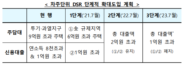 - 주택담보대출 : 투기·과열지구 9억원 초과 주택 > 전 규제지역 6억원 초과 주택 > 총 대출액 2억원 초과 > 총 대출액 1억원 초과
