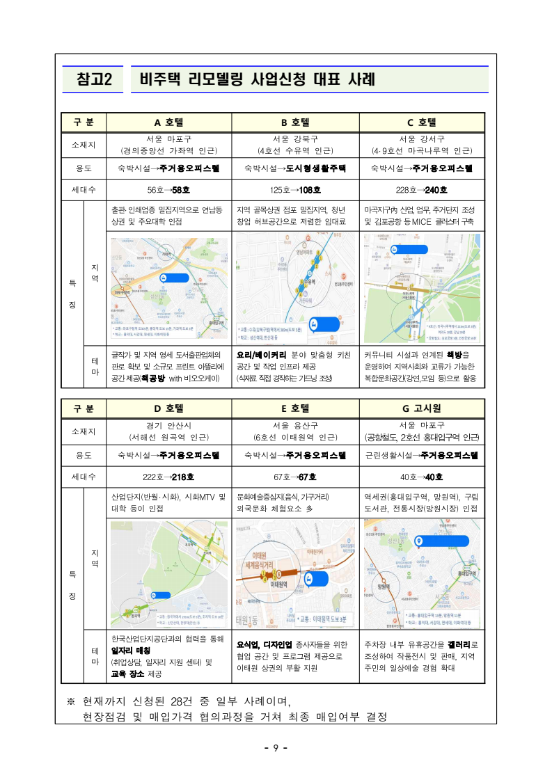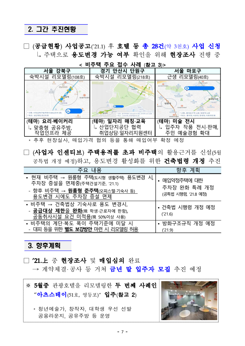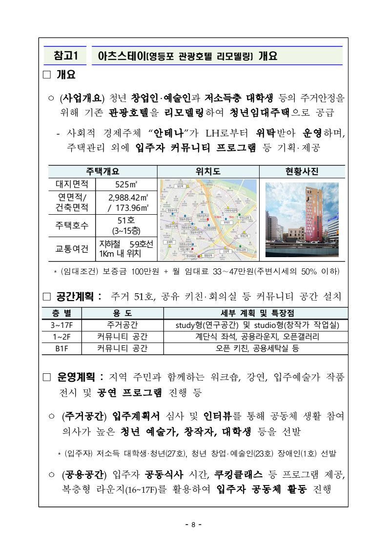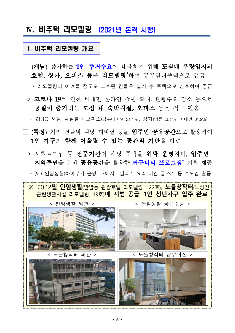 | ③ 비주택 리모델링 | - 1인 청년가구 위한 신규주택 공급 - 공유공간 활용, 커뮤니티 프로그램 운영 - 시세 50% 이하 저렴한 임대료 |