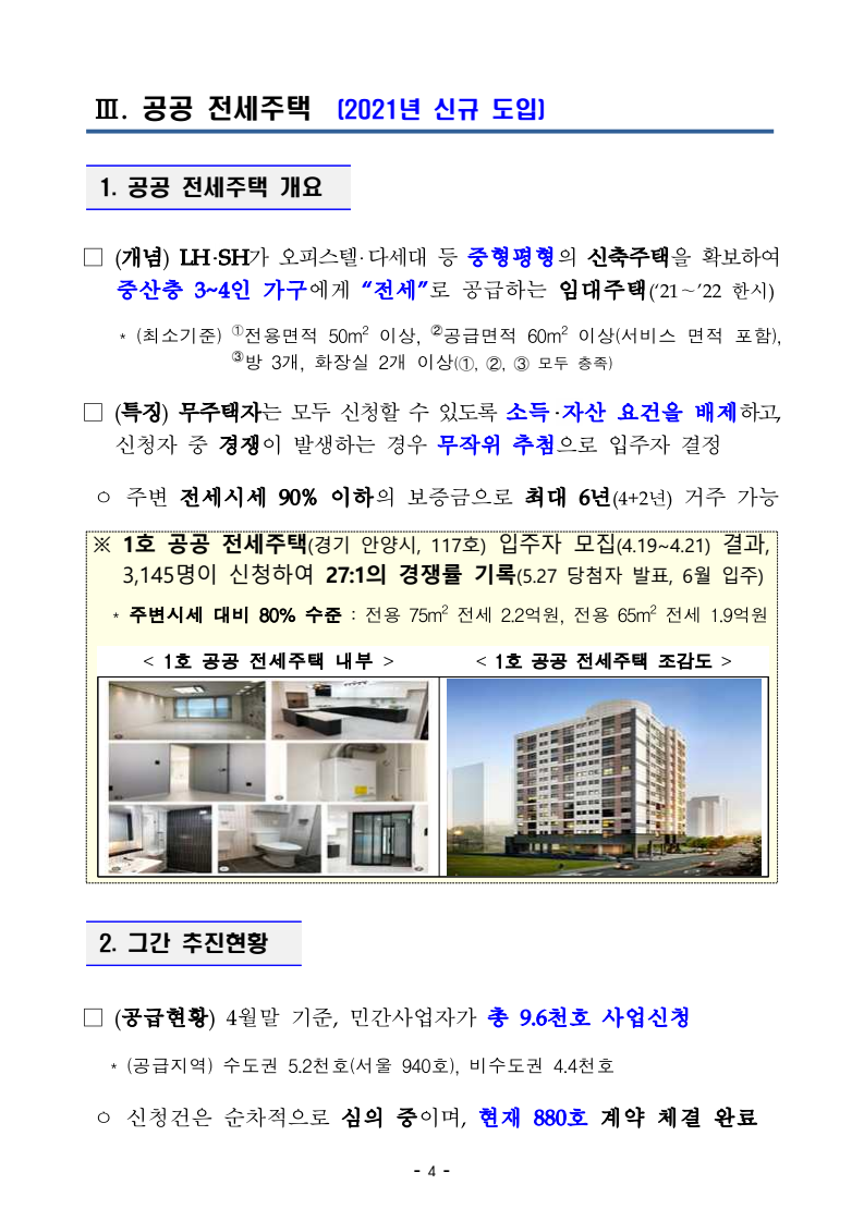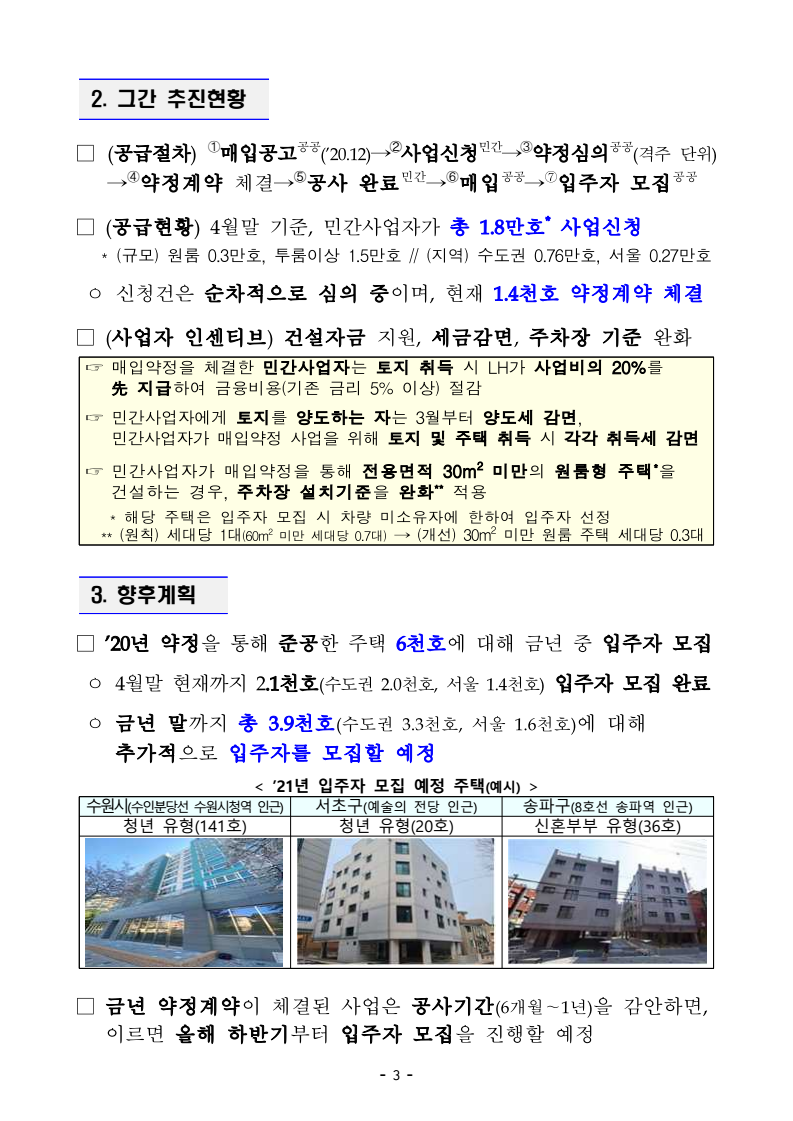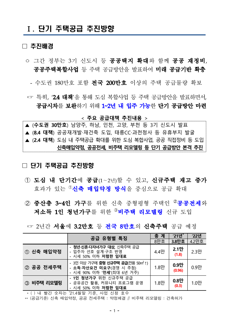 □ 국토교통부(장관 직무대행 윤성원)는 ‘2.4대책’ 후속조치의 일환으로 추진하는 단기 주택 공급방안이 4월말 기준, 민간사업자로부터 약 3만호 사업이 신청되는 등 차질없이 추진되고 있다고 밝혔다.