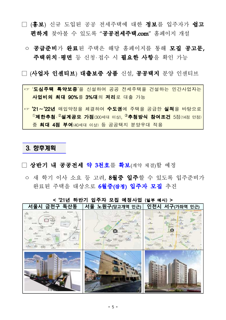 ㅇ 이를 통해, 3~4인 가구에게는 중형 평형 위주의 ② 공공 전세주택을, 1인 청년가구를 위해서는 ③ 비주택 리모델링 주택을 공급하여 다양한 계층에게 맞춤형 주택을 제공한다는 계획이다.