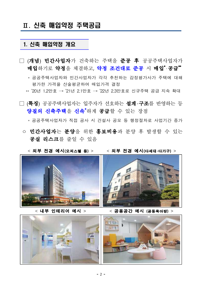 | ① 신축 매입약정 | - 청년‧신혼‧다자녀가구 대상, 신축주택 공급 - 입주자 선호 설계‧구조 반영 - 시세 50% 이하 저렴한 임대료 |