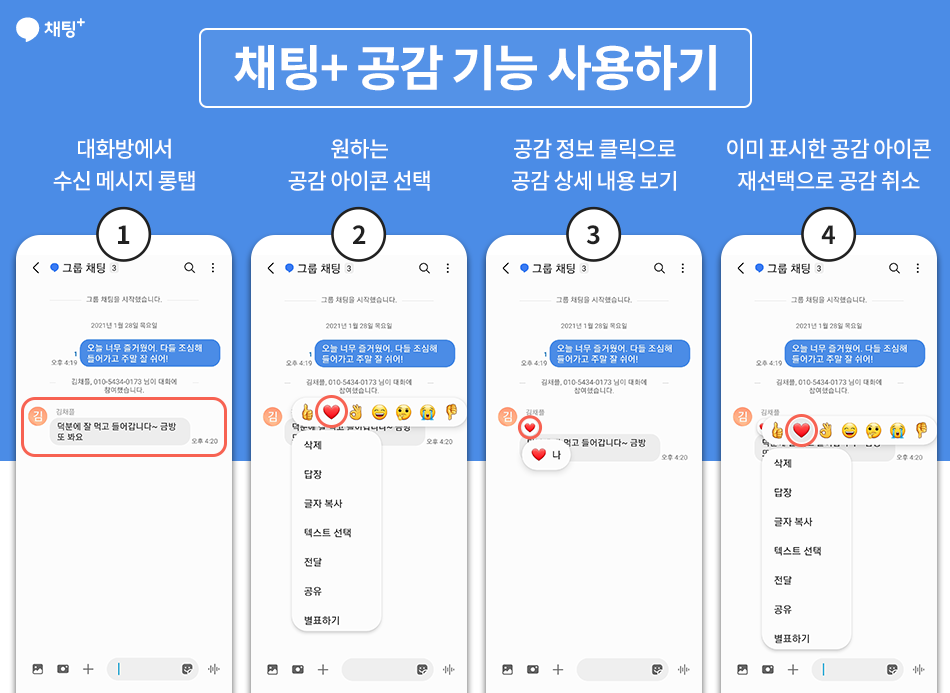 1. 상대방의 대화 내용 중 공감가는 메시지를 롱탭(2초 이상 누르기)하세요.