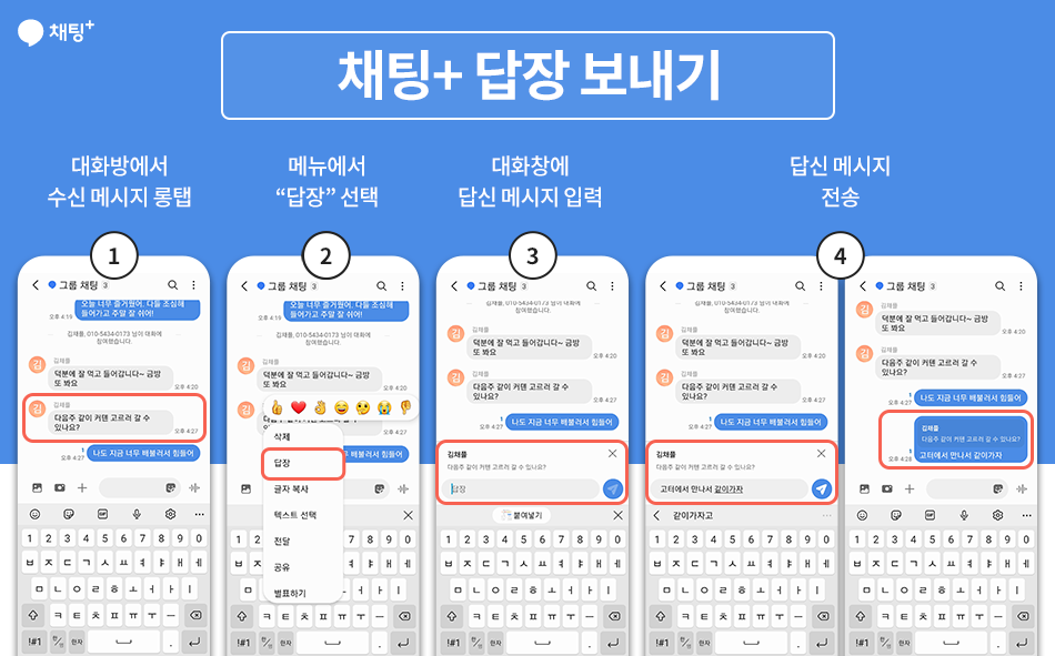 이미 지나간 메시지에도 답장하기 기능으로 편하게 대화를 이어나갈 수 있습니다.