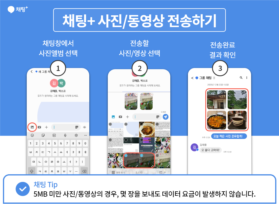 다른 메신저와 달리, 채팅플러스는 5MB 이하 파일 전송 시 데이터 요금이 발생하지 않습니다.