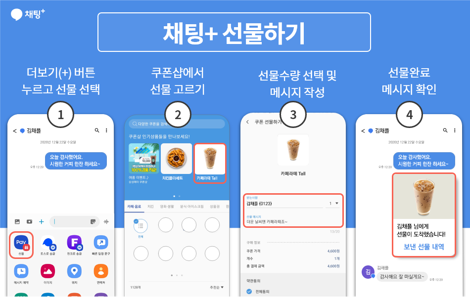 채팅플러스로 소중한 마음을 전해보세요. 대화창에서 쉽고 간편하게 선물을 보낼 수 있습니다.