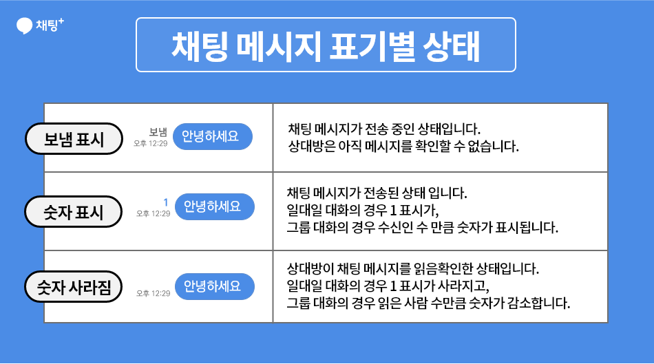 채팅+를 이용하시는 고객님끼리 메시지 읽음 확인 여부를 서로 확인하실 수 있습니다.