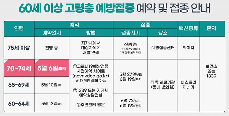 □ 백신 접종 관련, 중앙재난안전대책본부에서는 70세 이상 어르신의 예약률은 46.9%, 65~69세의 예약률은 31.3%(5.12일 0시 기준)로, 내일(5.13)부터는 60세 이상 어르신들의 예방접종 예약이 시작된다고 밝혔다.