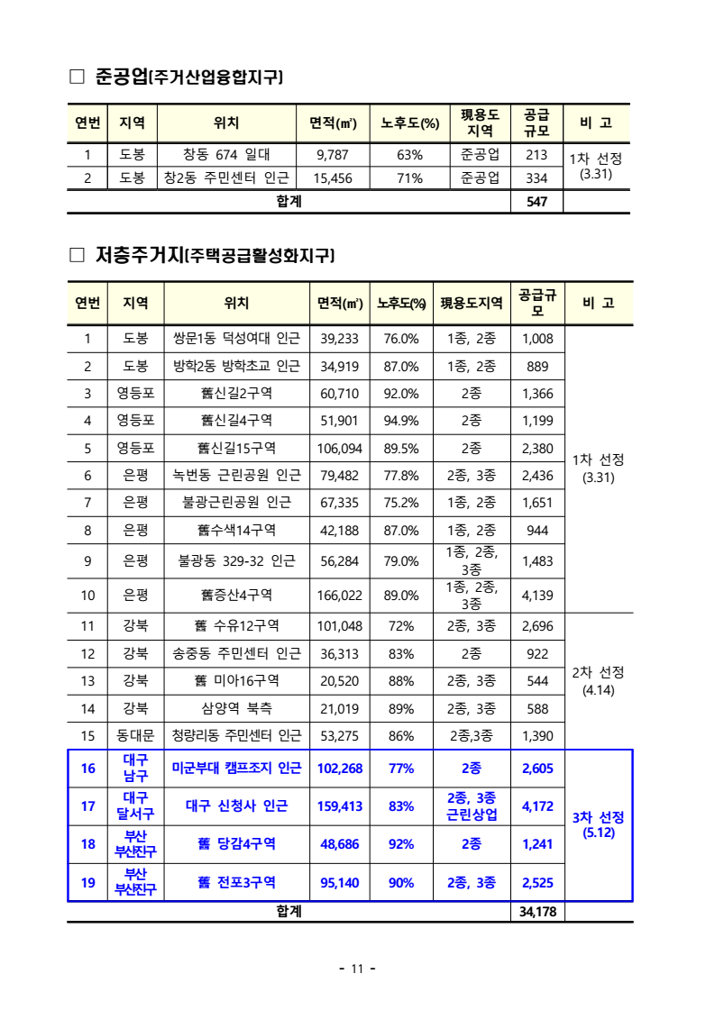 - 3차로 대구 2곳, 부산 2곳 추가 선정, 약 1만호 규모 공급