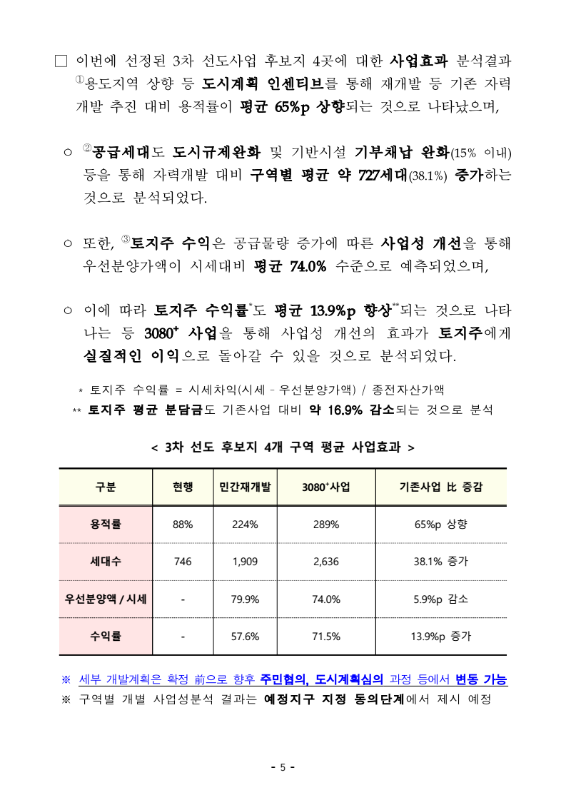 이번에 선정된 3차 선도사업 후보지 4곳에 대한 사업효과 분석결과 ①용도지역 상향 등 도시계획 인센티브를 통해 재개발 등 기존 자력개발 추진 대비 용적률이 평균 65%p 상향되는 것으로 나타났으며, ②공급세대도 도시규제완화 및 기반시설 기부채납 완화(15% 이내) 등을 통해 자력개발 대비 구역별 평균 약 727세대(38.1%) 증가하는 것으로 분석되었다.