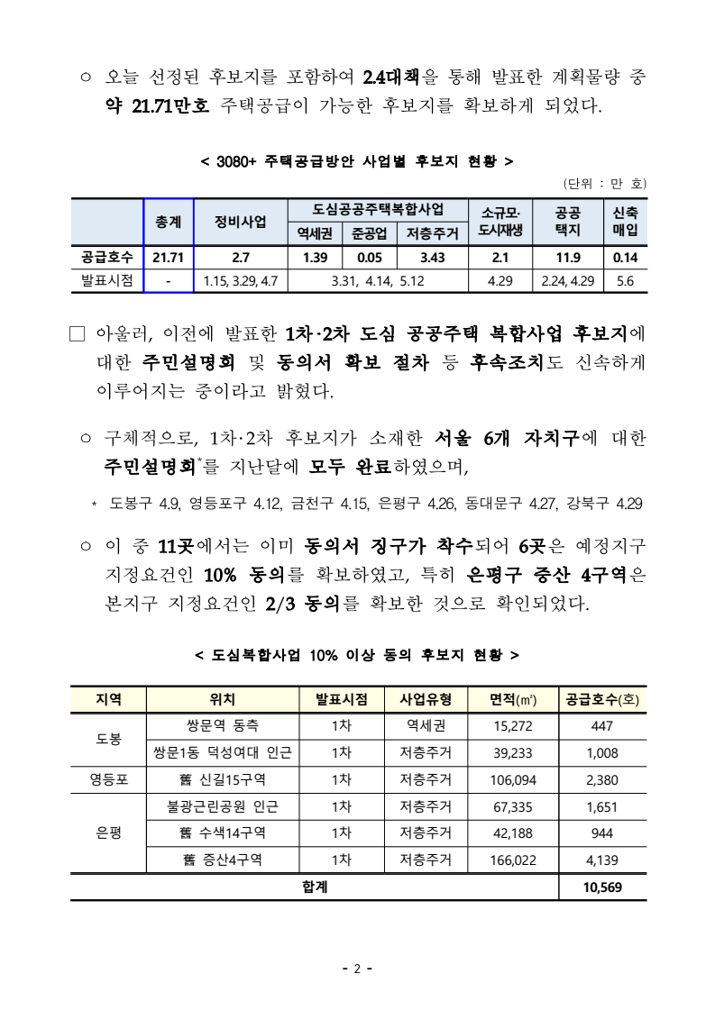 아울러, 이전에 발표한 1차·2차 도심 공공주택 복합사업 후보지에 대한 주민설명회 및 동의서 확보 절차 등 후속조치도 신속하게 이루어지는 중이라고 밝혔다.