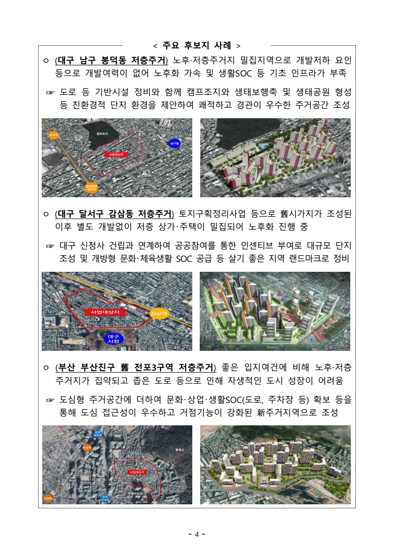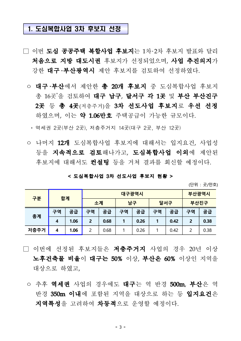 대구·부산에서 제안한 총 20개 후보지 중 도심복합사업 후보지 총 16곳*을 검토하여 대구 남구, 달서구 각 1곳 및 부산 부산진구 2곳 등 총 4곳(저층주거)을 3차 선도사업 후보지로 우선 선정하였으며, 이는 약 1.06만호 주택공급이 가능한 규모이다.