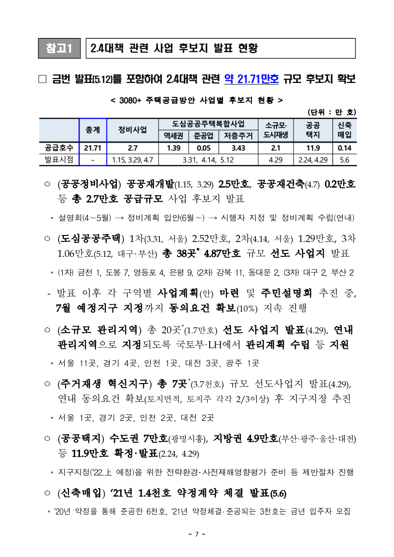 3080+ 주택공급방안 발표 이후 통합지원센터를 개소하여 신규사업에 대한 1,300여 건의 컨설팅을 지원하고 491곳의 후보지를 접수하여 입지요건 및 사업가능성을 검토 중이며, 오늘 선정된 후보지를 포함하여 2.4대책을 통해 발표한 계획물량 중 약 21.71만호 주택공급이 가능한 후보지를 확보하게 되었다.