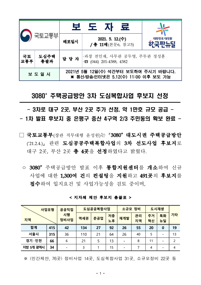 국토교통부(장관 직무대행 윤성원)는 「3080+ 대도시권 주택공급방안(‘21.2.4.)」 관련 도심공공주택복합사업의 3차 선도사업 후보지로 대구 2곳, 부산 2곳 총 4곳을 선정하였다고 밝혔다.