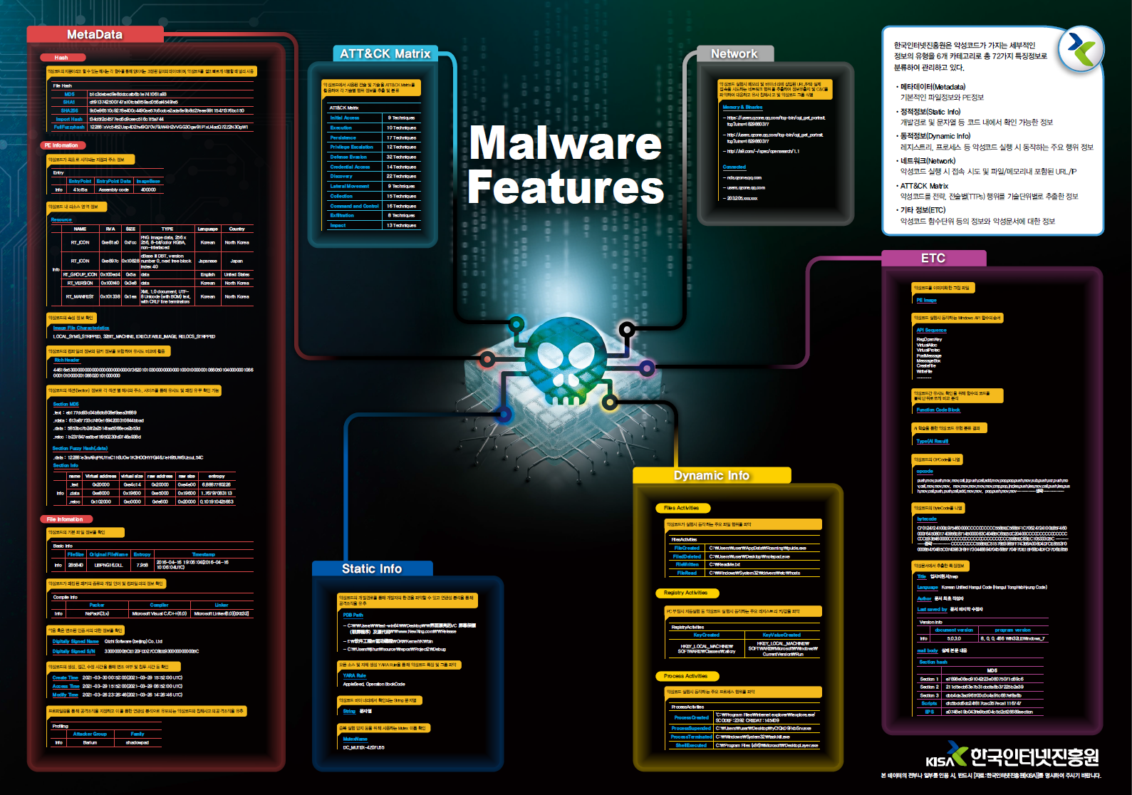 이번에 공개되는 악성코드 특징정보는 ▲_meta_Data(파일의 일반적인 속성) ▲Dynamic Info ▲Static Info(파일의 악성행위 정보) ▲Network ▲ATT&CK Matrix(악성코드 공격의 전략·기술) ▲ETC(그 외 부가적인 주요 데이터)로 총 6개의 항목으로 분류 및 정의되어 있으며, 항목별 세부 특징정보 72개와 예시 데이터 및 설명을 제시하고 있다.