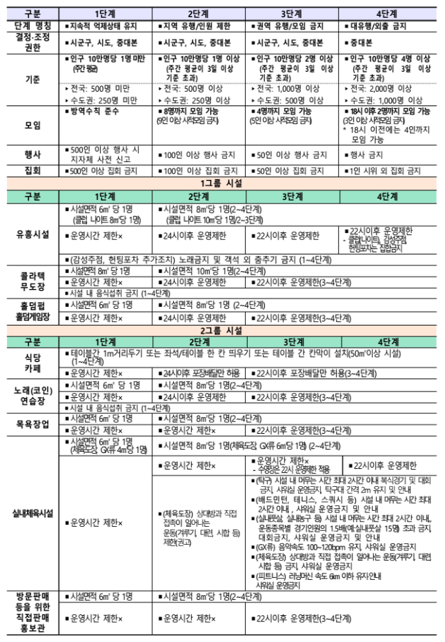 | 다중이용시설 | ▪제한 없음 | ▪이용인원 축소 ▪유흥시설 등, 노래 연습장, 식당‧카페 24시 제한 |