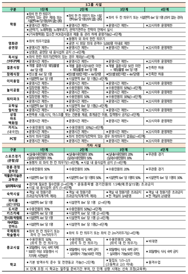 | 다중이용시설 | ▪제한 없음 | ▪이용인원 축소 ▪유흥시설 등, 노래 연습장, 식당‧카페 24시 제한 |