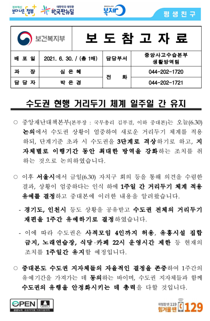 ○ 중앙재난대책본부(본부장 : 국무총리 김부겸, 이하 중대본)는 오늘(6.30) 논의에서 수도권 상황이 엄중하여 새로운 거리두기 체계를 적용하되, 단계기준 초과 시 수도권을 3단계로 격상하기로 하고, 지자체별로 이행기간 동안 최대한 방역을 강화하는 조치를 취하는 것으로 논의하였습니다.