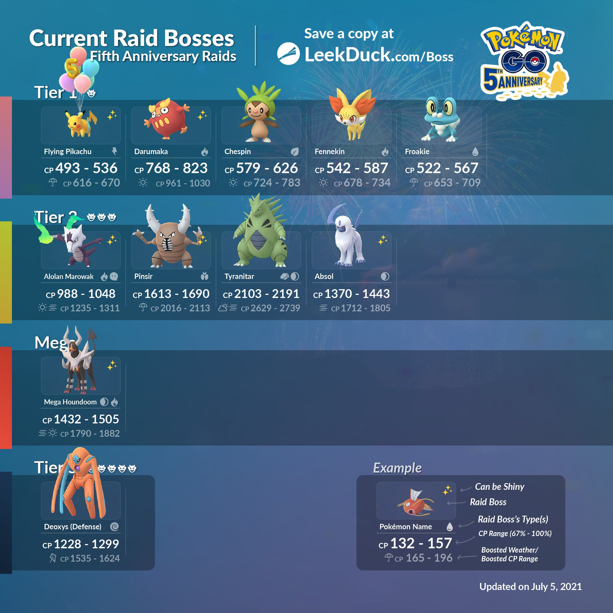 - "달막화", 5 모양 풍선을 단 "공중날기 피카츄", "도치마론", "푸호꼬", "개구마르"가 별1 레이드에 등장합니다.