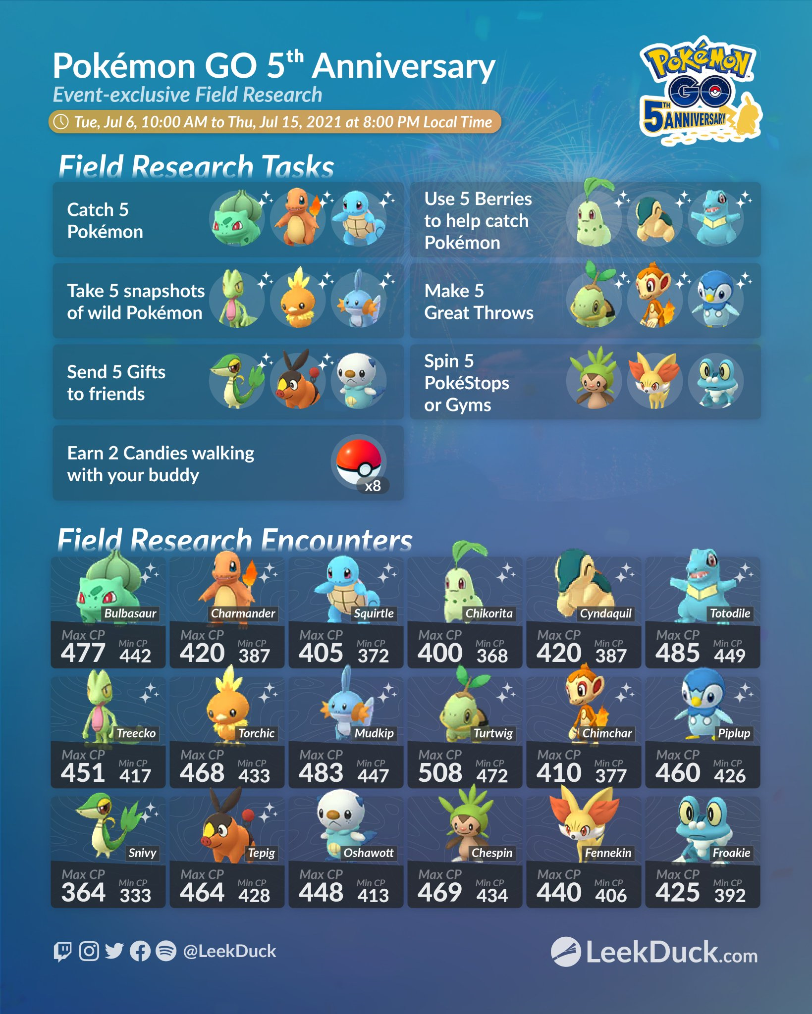 - "이상해씨", "파이리", "꼬부기", "치코리타", "브케인", "리아코", "나무지기", "아차모", "물짱이", "모부기", "불꽃숭이", "팽도리", "주리비얀", "뚜꾸리", "수댕이", "도치마론", "푸호꼬", "개구마르"와 같은 첫 번째 파트너 포켓몬을 만날 수도 있는 신규 일일 보너스 "필드리서치" 과제를 받게 됩니다.