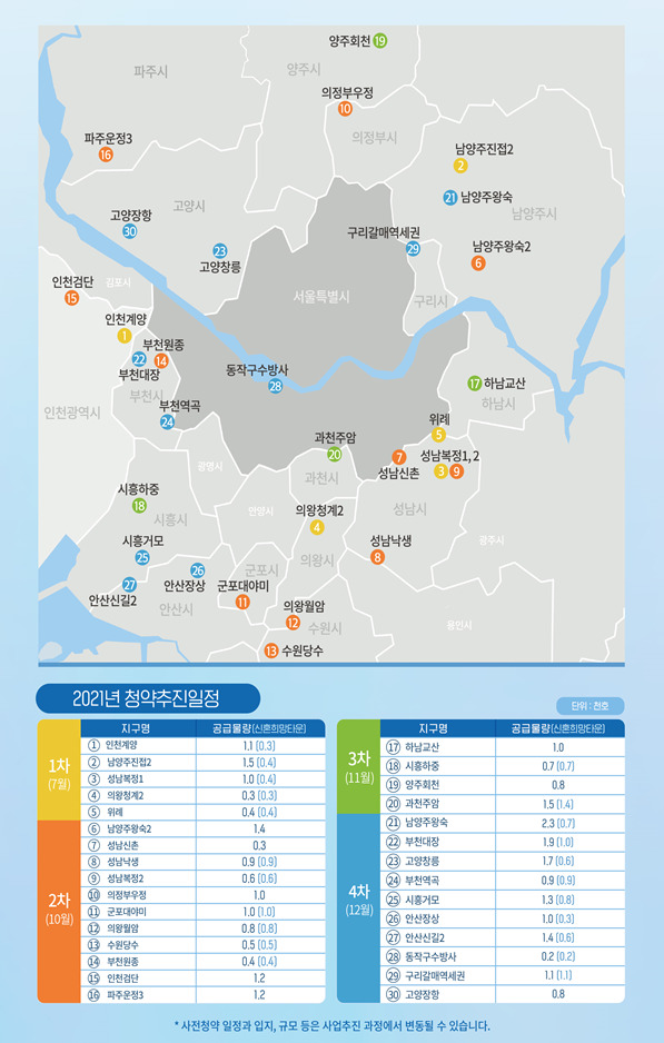 ㅇ 12월에는 남양주왕숙ㆍ부천대장ㆍ고양창릉 등 3기 신도시에서 5.9천호, 구리갈매역세권(1.1천호)ㆍ안산신길2(1.4천호) 등의 입지에서도 공급된다.