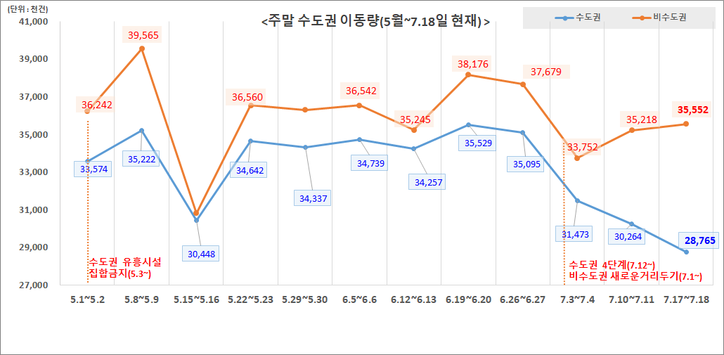 < 전국 주말 이동량(5월∼ 7월 18일 현재 >