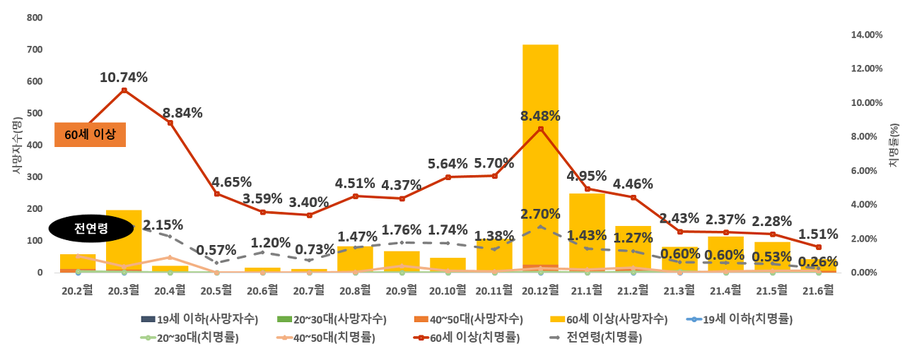 < 연령별 치명률 추이 (’20.2월.∼’21.6월) >