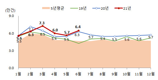* 연도별 6월 누계(만건): (’17)45.8→ (’18)43.7→ (’19)31.4→ (’20)62.1→ (’21)55.9
