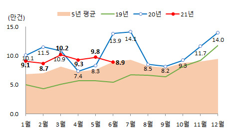 ㅇ 전월(‘21.5월, 97,524건) 대비 8.8% 감소, 전년 동월(’20.6월, 138,578건) 대비 35.8% 감소하였다