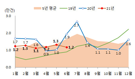 * 연도별 6월 누계(만건) : (’17)87.4→(’18)93.4→(’19)99.3→(’20)112.6→(’21)115.9