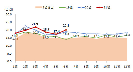 * 연도별 6월 누계(만건): (’17)45.8→ (’18)43.7→ (’19)31.4→ (’20)62.1→ (’21)55.9