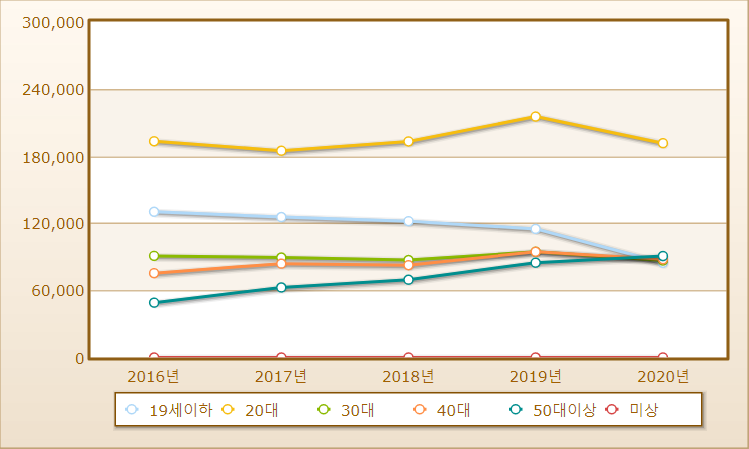 자격취득자 연령별 추이 (2020년 현재 연령기준)