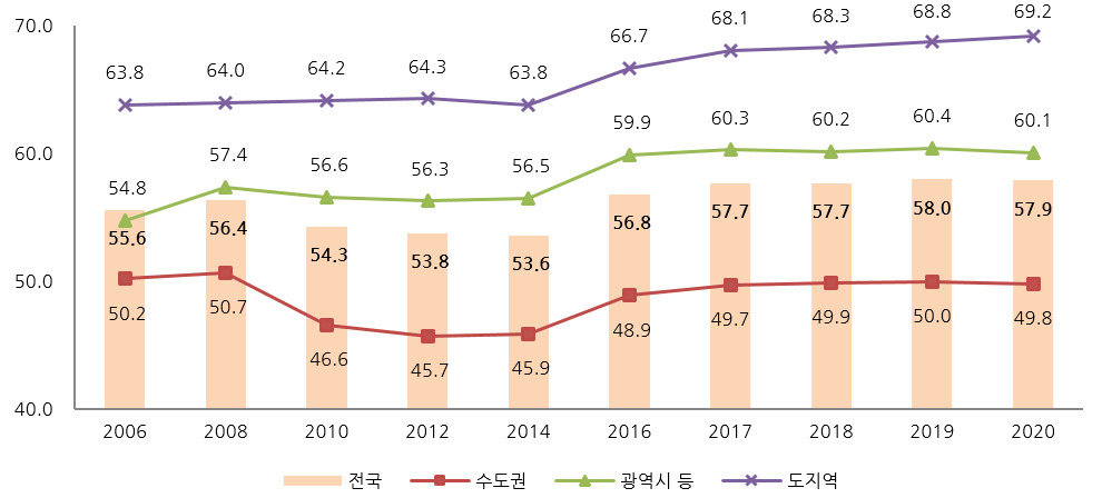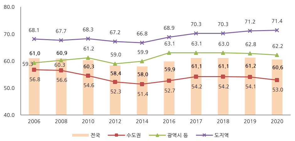 * (수도권) 54.1% → 53.0%, (광역시 등) 62.8 → 62.2, (도지역) 71.2 → 71.4
