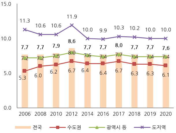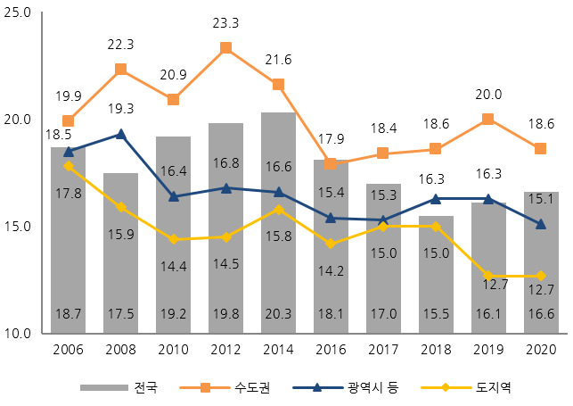 평균(%) : (전국) 21.3→ 20.9, (수도권) 24.6→23.7, (광역시 등) 17.7→17.9, (도지역) 14.6→14.6