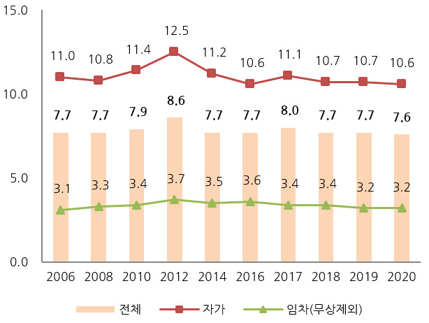 | 자가가구 | 2.3 | 2.2 | 2.4 | 2.3 | 2.5 | 2.7 | 2.8 | 18.0 | 17.4 | 17.8 | 17.2 | ||