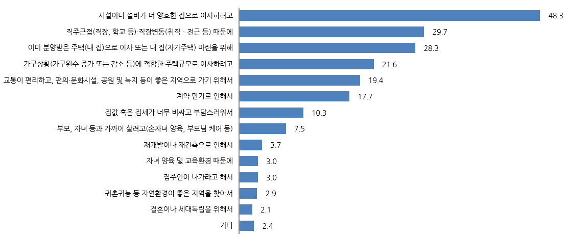 □ (이사이유) 이사경험이 있는 가구를 대상으로 현재주택으로 이사한 이유를 조사한 결과, ‘시설이나 설비 상향’(48.3%), ‘직주근접(29.7%)’, ‘주택마련을 위해(28.3%)’ 순으로 나타났다.