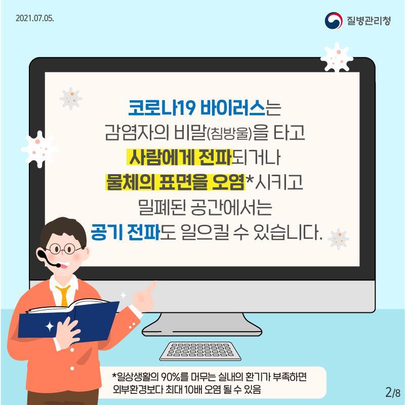 코로나19 바이러스는 감염자의 비말(침방울)을 타고 사람에게 전파되거나 물체의 표면을 오염시키고 밀폐된 공간에서는 공기 전파도 일으킬 수 있습니다.