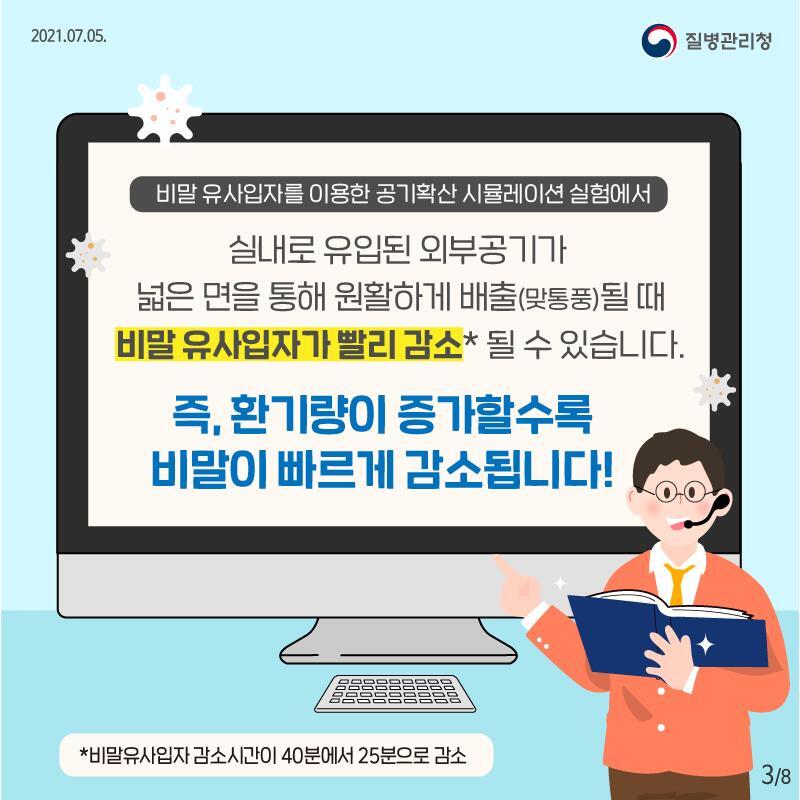 실내로 유입된 외부공기가 넓은 면을 통해 원할하게 배출(맞통풍)될 때 비말 유사입자가 빨리 감소될 수 있습니다.
