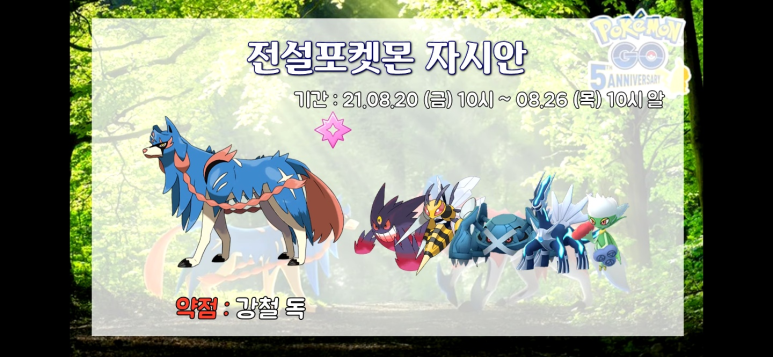 한국시간 2021년 8월 20일(금) 10시부터 2021년 8월 26일(목) 10시까지 "레이드배틀"에 다음 포켓몬이 등장합니다.