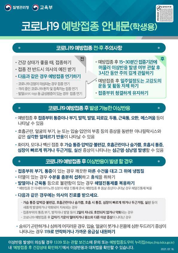 일상생활 (EveryDay) 코로나19 예방접종 안내문 및 Q&A (학생용) by 날으는물고기 2021. 8. 22. 코로나19 예방접종 안내문 및 Q&A (학생용) 728x90 알아두면 편리한 코로나19 백신 사전예약 꿀팁 출처 : 질병관리청 728x90 그리드형(광고전용) 공유하기 게시글 관리 pages.kr 날으는물고기 <º)))>< 저작자표시 비영리 동일조건 (새창열림) 관련글 재난지원금 국민 88% 1인당 25만원 추석 전 지급개시 (코로나19 피해지원 3종 패키지) 매매·임대차 중개보수 인하 개편 및 중개서비스 개선 포켓몬고 이벤트 울트라 언록 파트 3 "검과 방패" 여름철 올바른 환기 방법 안내 (코로나 바이러스 대비 3원칙) 댓글