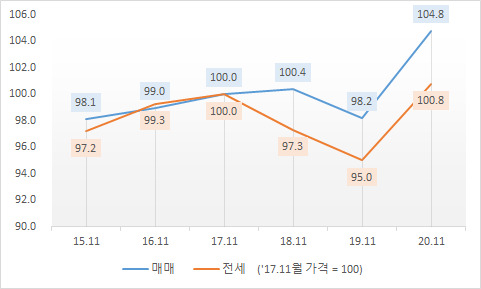 | < 6억 이상 매매 중개거래 비중 변화(%) > | < 전국 아파트 가격지수 변화(부동산원) > |