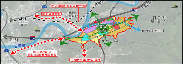 - 중앙공원을 중심으로 노고산, 공릉천 등과 연계한 공원녹지축 구축
