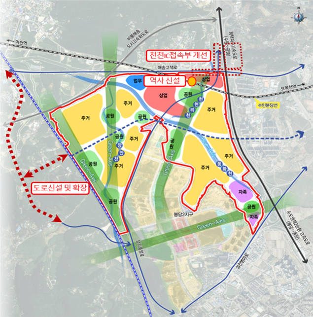 ㅇ (개발방향) 봉담2지구와 연계한 가로망체계 및 보행녹지축 등을 구축하여 통합적인 도시공간체계 구축*
