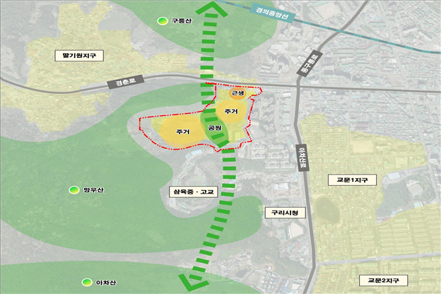 | ㆍ(위치) 구리시 교문동 일원 ㆍ(면적/호수) 10만㎡(3만평) / 0.2만호 ㆍ(입지여건) 서울시 경계로부터 약 1km 동측에 위치한 서울 인접 지역 ㆍ(개발구상) 자연순응형 설계를 통한 자연친화적 주거단지 조성 - 망우산·구룡산·아차산 녹지축과 연계한 공원·녹지 조성 |