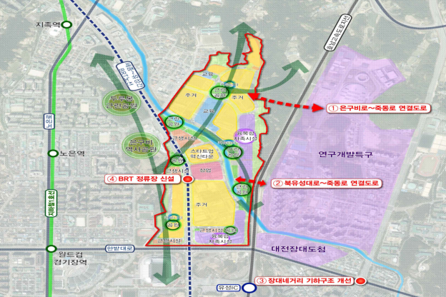 ㅇ 대덕연구개발특구와 대전장대 도시첨단산업단지를 연계하여 양질의 주거용지와 자족용지 공급을 통한 지역상생 혁신플랫폼 구축