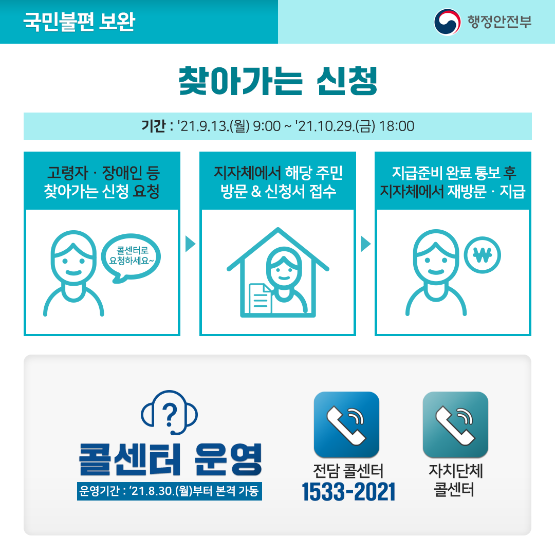 □ 남은 일주일의 기간 동안 신청·지급 시스템 등 제반 사항을 철저히 확인·점검하는 한편, 신청·지급이 시작된 이후에도 콜센터*, 찾아가는 신청**, 온라인 이의신청 등을 통해 국민 여러분들의 불편이 최소화되도록 조치할 예정이다.
