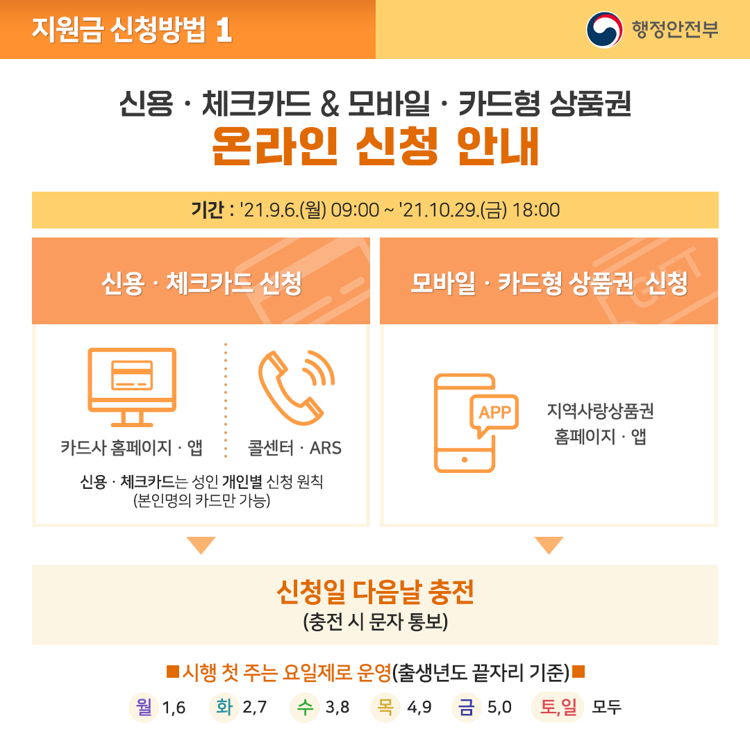 □ 신용ㆍ체크카드 충전을 원하는 국민은 9월 6일(월)부터 본인이 사용하는 카드사의 홈페이지나 앱을 통해 온라인으로 신청할 수 있으며, 9월 13일(월)부터는 카드와 연계된 은행에서 오프라인 신청도 가능하다.