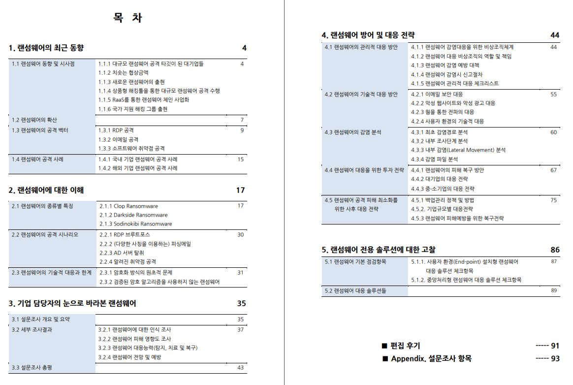 | 1. 랜섬웨어의 최근 동향 1.1 랜섬웨어 동향 및 시사점 1.2 랜섬웨어의 확산 1.3 랜섬웨어의 공격 벡터 1.4 랜섬웨어 공격 사례 2. 랜섬웨어에 대한 이해 2.1 랜섬웨어의 종류별 특징 2.2 랜섬웨어의 공격 시나리오 2.3 랜섬웨어의 기술적 대응과 한계 3. 기업 담당자의 눈으로 바라본 랜섬웨어 3.1 설문조사 개요 및 요약 3.2 세부 조사결과 3.3 설문조사 총평 4. 랜섬웨어 방어 및 대응 전략 4.1 랜섬웨어의 관리적 대응 방안 4.2 랜섬웨어의 기술적 대응 방안 4.3 랜섬웨어의 감염 분석 4.4 랜섬웨어 대응을 위한 투자 전략 4.5 랜섬웨어 공격 피해 최소화를 위한 사후 대응 전략 5. 랜섬웨어 전용 솔루션에 대한 고찰 5.1 랜섬웨어 기본 점검항목 5.2 랜섬웨어 대응 솔루션들 참고1. 편집 후기 참고2. Appendix. 설문조사 항목 |
